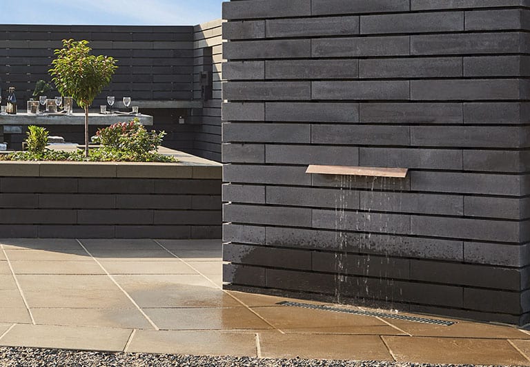 Mulighederne er mange med vores skønne Nordic Wall mursystem: Et stilrent indbygget vandfald til terrassen.