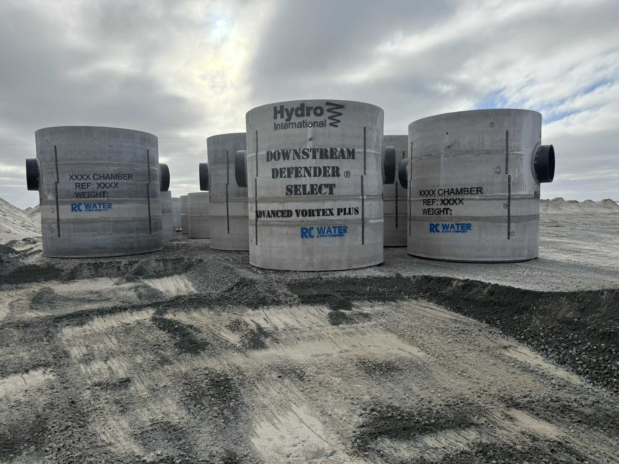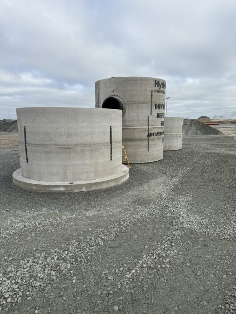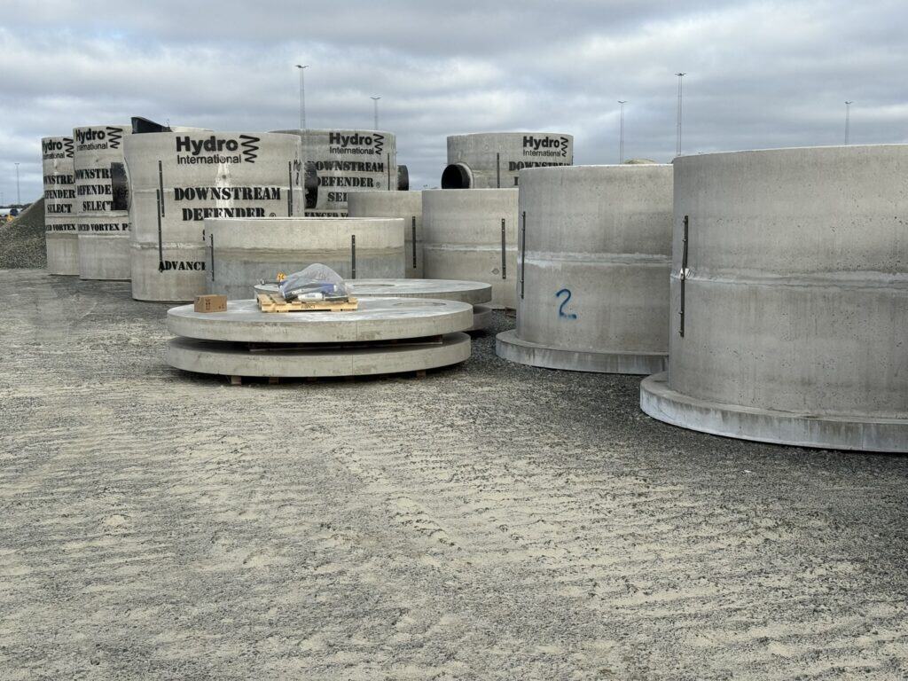 Til et større projekt har vi leveret og installeret otte Downstream Defender® Select-enheder fra produktionen i Linå. Hver enhed vejer ca. 40 ton, har en diameter på tre meter og sænkes ned i dybe udgravninger som permanente komponenter i afløbssystemet. Enhederne står skjult under terræn, men varetager en central funktion i rensningen af overfladevand, før det ledes videre til recipient.